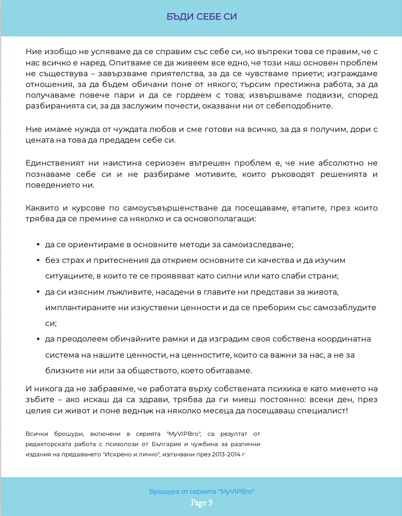„Бъди себе си“ е една от най-краткото програмни брошури. Ако имате нужда от ръководство как да опознаете себе си – това е вашето. То ще ви помогне да се отнасяте към себе си с любов, внимание и приемане. Брошурата е част от поредицата по приложна психология, създадена към книгата на Миглена Ангелова „Искрено и лично за Големия VIP Брат“, която ЩЕ ПРОМЕНИ живота Ви.