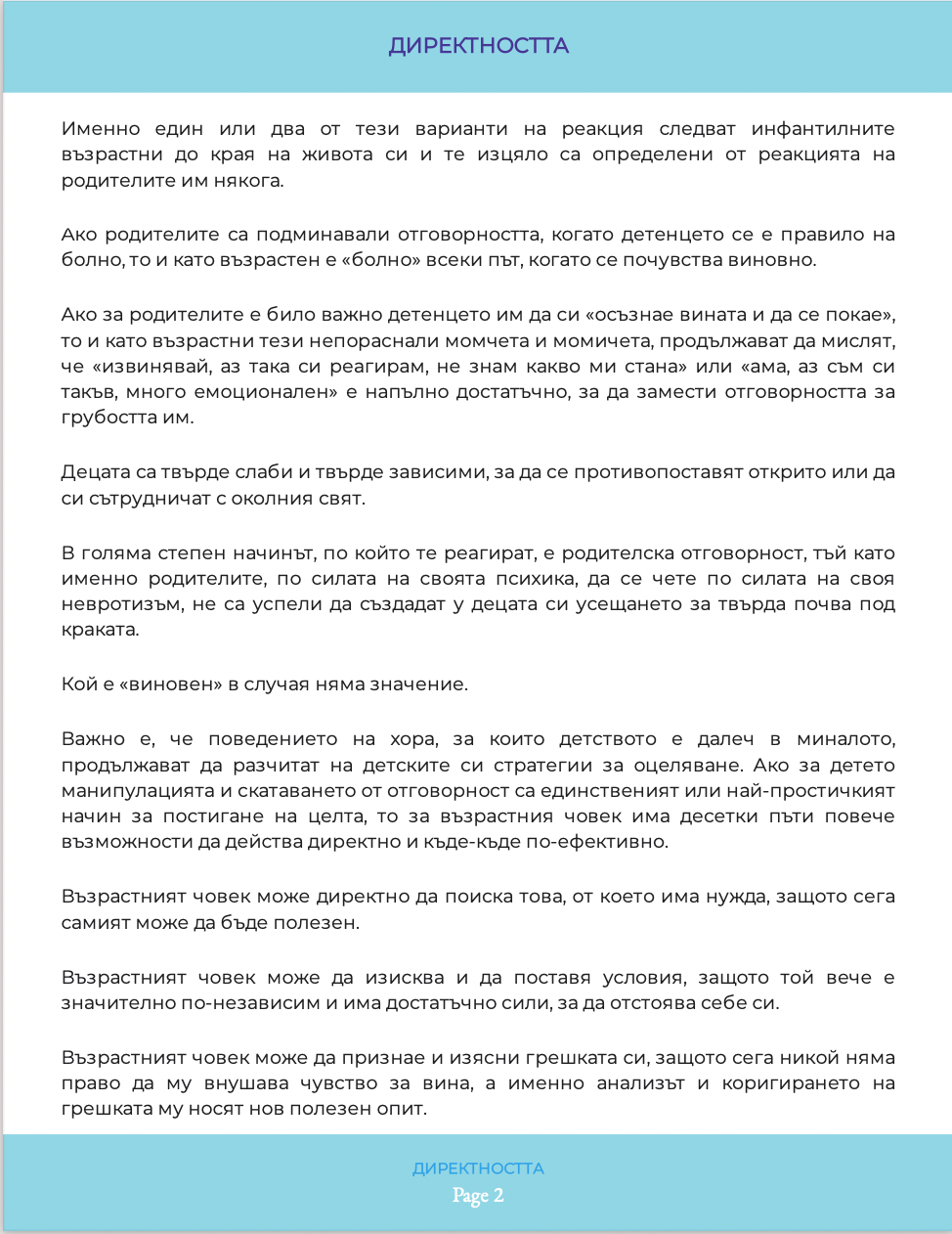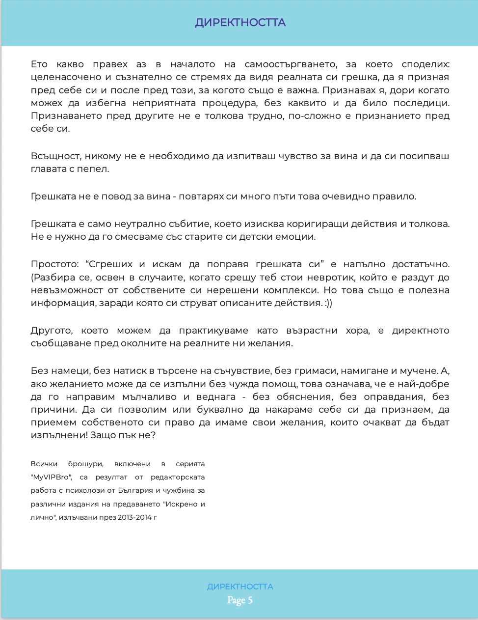 Какво отличава директните хора и какви качества предполага директността. Какви са похватите за манипулация върху слабохарактерните хора, каква стратегия да изберем, за да не попаднем в капаните им. Вина и отговорност – как да не се поддаваме на някогашните родителско-учителски внушения сега, когато вече сме самостоятелни хора. Брошурата е част от поредицата по приложна психология, създадена към книгата на Миглена Ангелова „Искрено и лично за Големия VIP Брат“, която ЩЕ ПРОМЕНИ живота Ви.