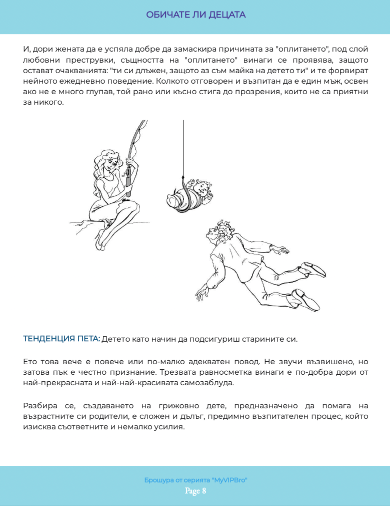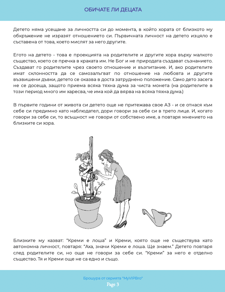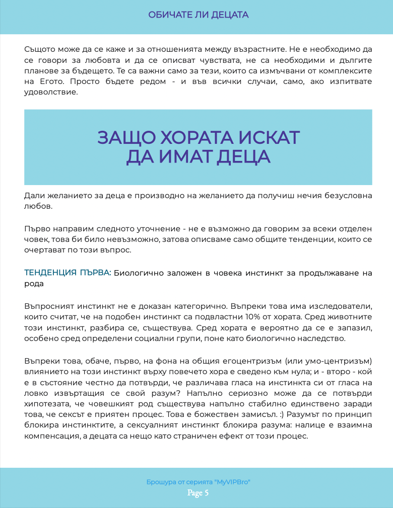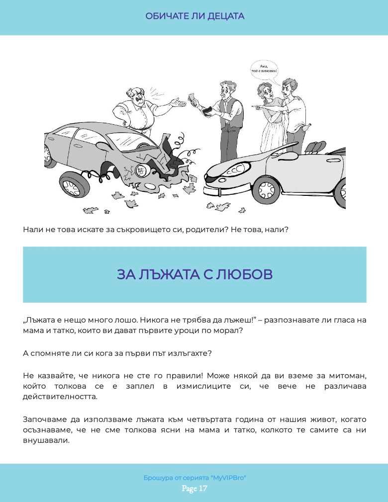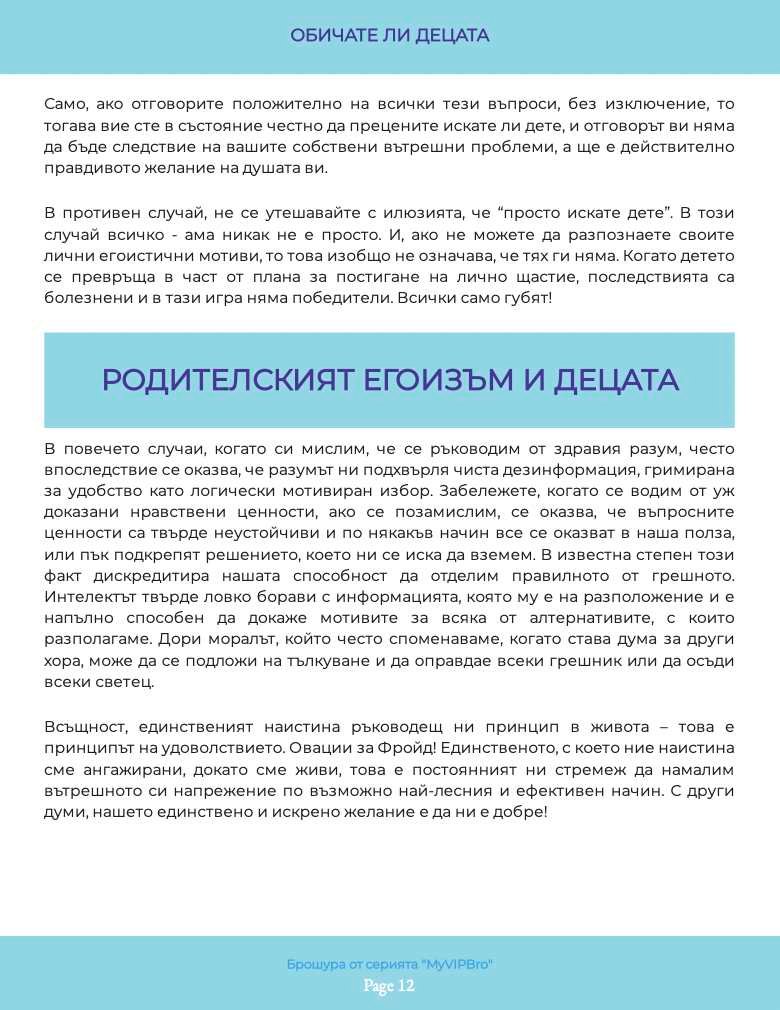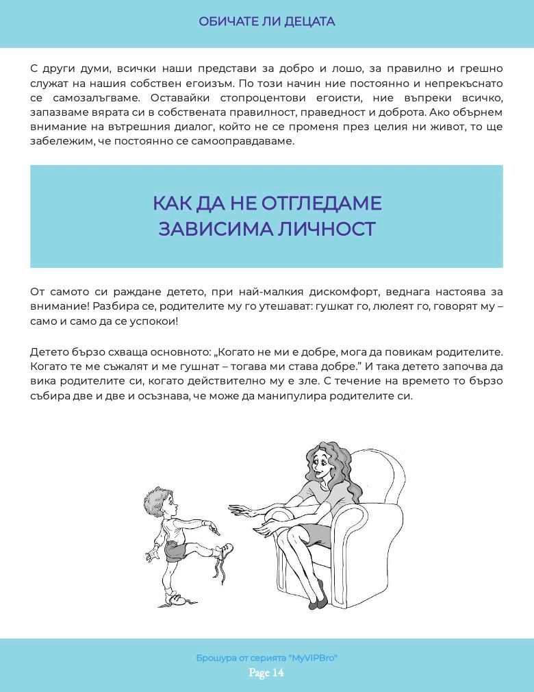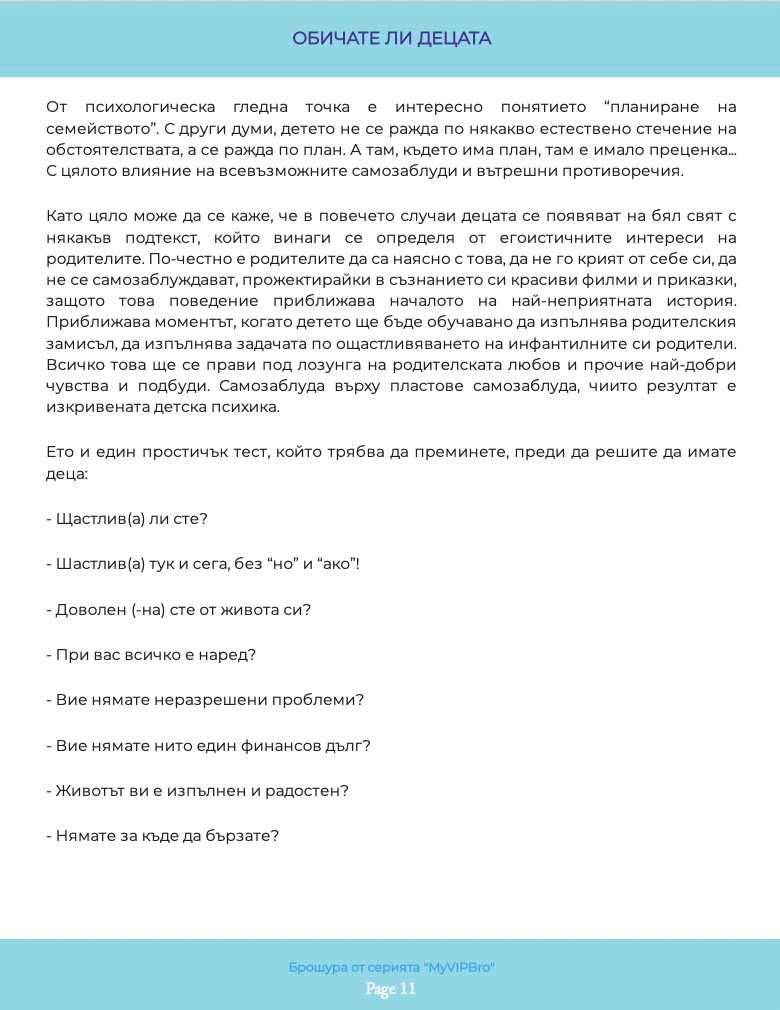 Илюстрираната брошура „Обичате ли децата“ необходима на всеки от нас, и в качеството ни на деца на родителите си, и като настоящи или бъдещи родители. Какви са грешките, направени спрямо нас. Как да ги обезболим и възможно ли е да ги преодолеем с времето – тази книга ще ви запознае не само с въпросите, но и с отговорите, които не са „полит коректни“ в наши дни, защото са искрени и директни. Брошурата е част от поредицата по приложна психология, създадена към книгата на Миглена Ангелова „Искрено и лично за Големия VIP Брат“, която ЩЕ ПРОМЕНИ живота Ви.