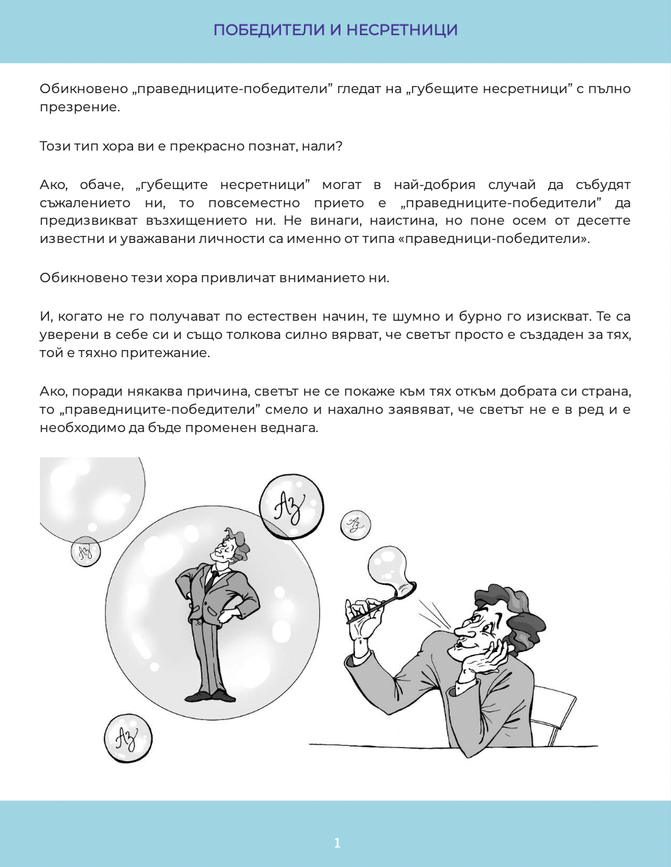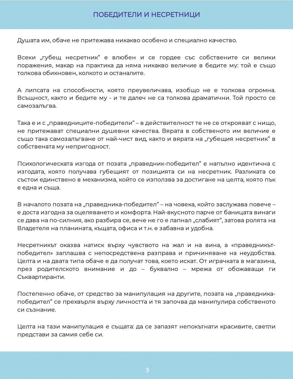 Сигурно си мислите, че победителите са едни такива щастливи хора, които постигат всичко в живота си без никакви затруднения. А губещите винаги са прецакани нещастници. Това не е така. От гледна точка на психологията и победителите, и губещите са роли, които избираме и играем доброволно, подчинени на страховете си, на детските си стратегии за оцеляване… Прочетете повече и се ориентирайте къде се намирате вие. Единствено знанията променят живота ни. Брошурата е част от поредицата по приложна психология, приложена към книгата на Миглена Ангелова „Искрено и лично за Големия VIP Брат“.