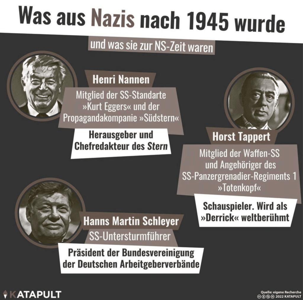 Когато бях в Германия, попаднах на страхотна инфографика, подготвена от едно от любимите ми списания “Katapult Magazin”: какво е станало с членовете на НСДАП и техните симпатизанти след 1945 г. Хайнрих Нанен, член на СС “Курт Егерс” и на бойната пропагандна група “Südstern” – издател и главен редактор на списание “Stern”. Ханс Мартин Шлайер, унтерщурмфюрер […]
