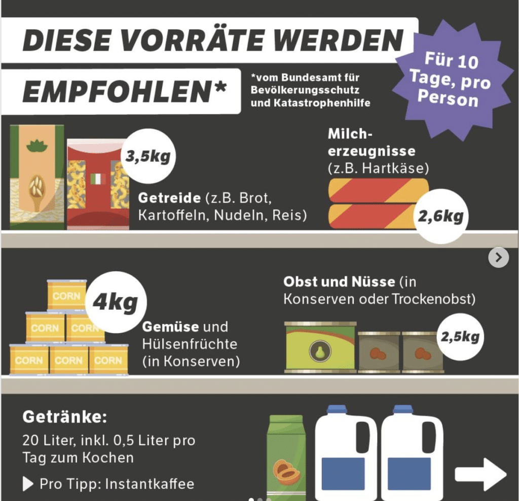 В Германия има официален списък с неща от първа необходимост при бедствия. Пълният списък можете да видите на сайта на Федералната служба за гражданска защита и помощ при бедствия. Целта е да изкарате 10 дни, без да ви се налага да пазарувате. Списъкът включва хранителни продукти (с грамаж), лекарства, хигиенни продукти, предавателни устройства, свещи, батерии […]